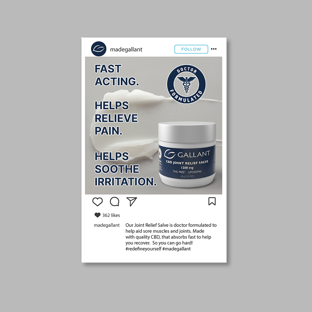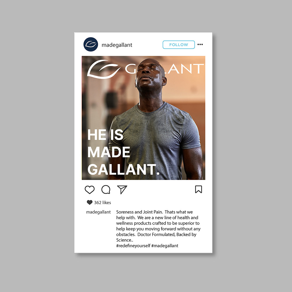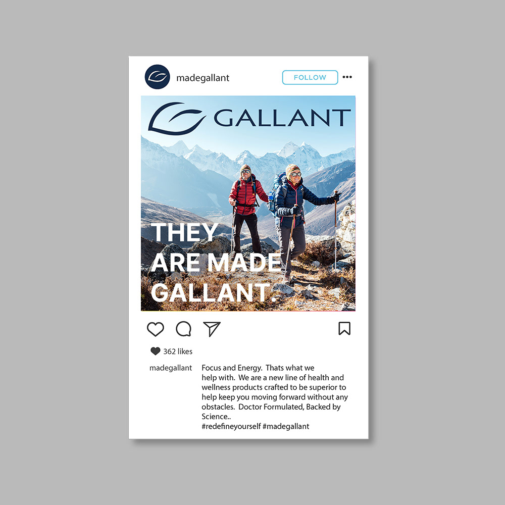 I built Gallant from scratch as a new kind of performance wellness brand, one designed to serve the modern-day warrior. Rooted in science and driven by purpose, Gallant needed to cut through a cluttered category filled with overhyped, underperforming CBD brands. I started with strategy, anchored the brand in the Hero archetype, and developed a full identity system that fused strength, growth, and clarity into every touchpoint.