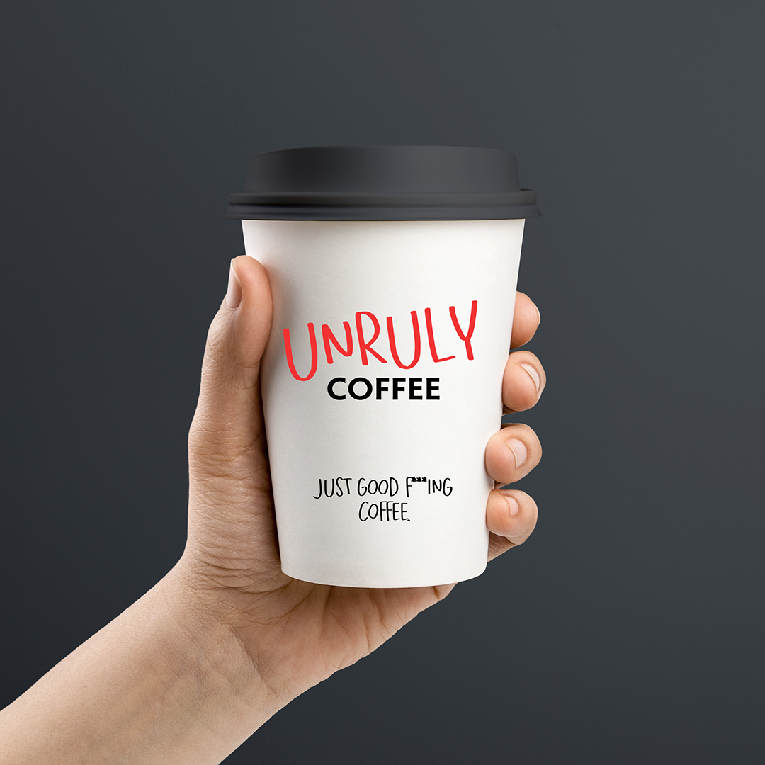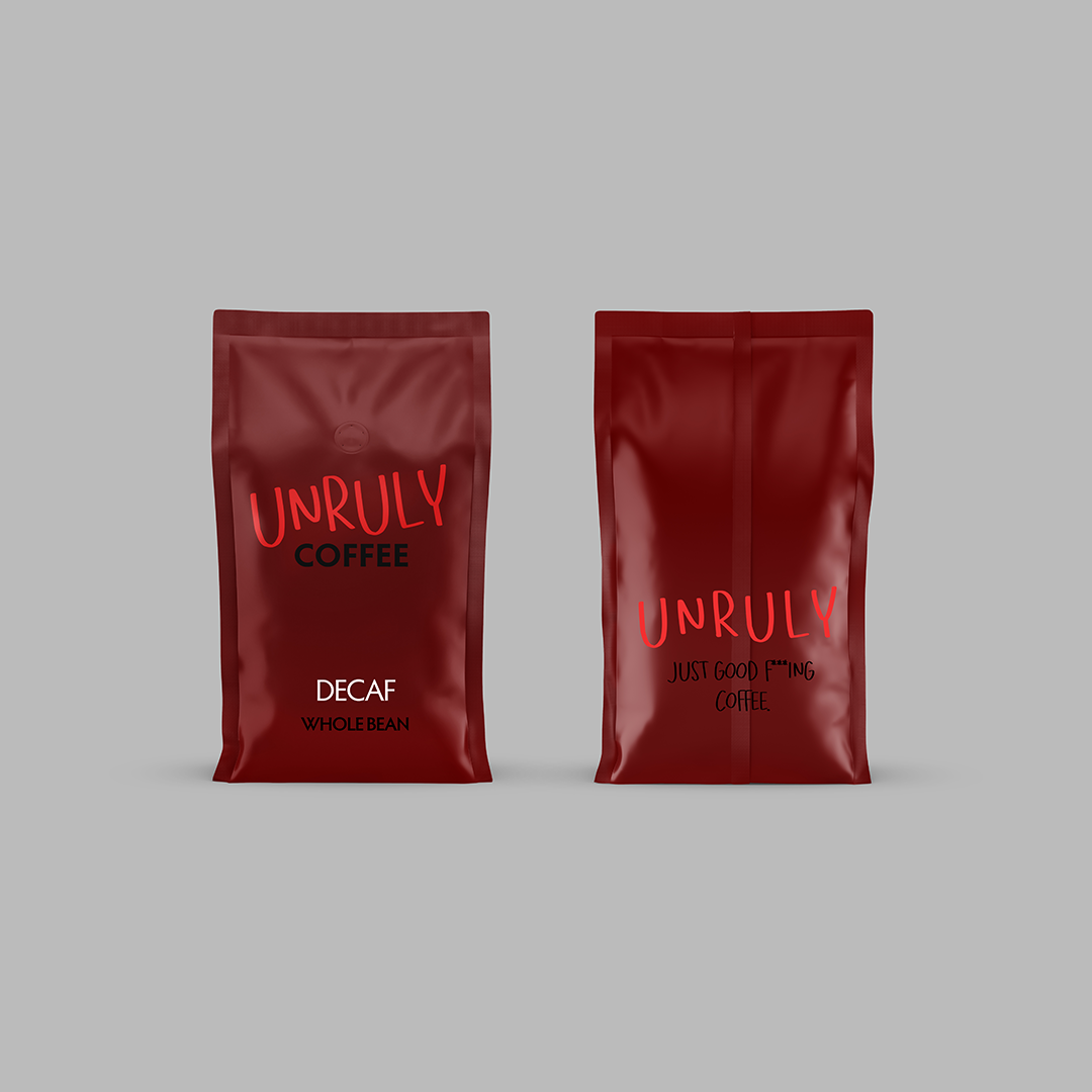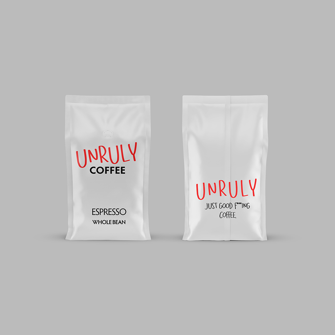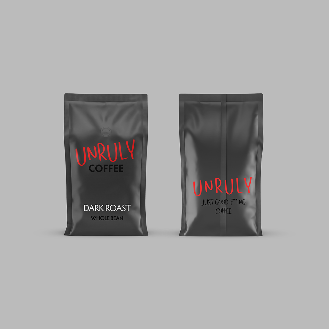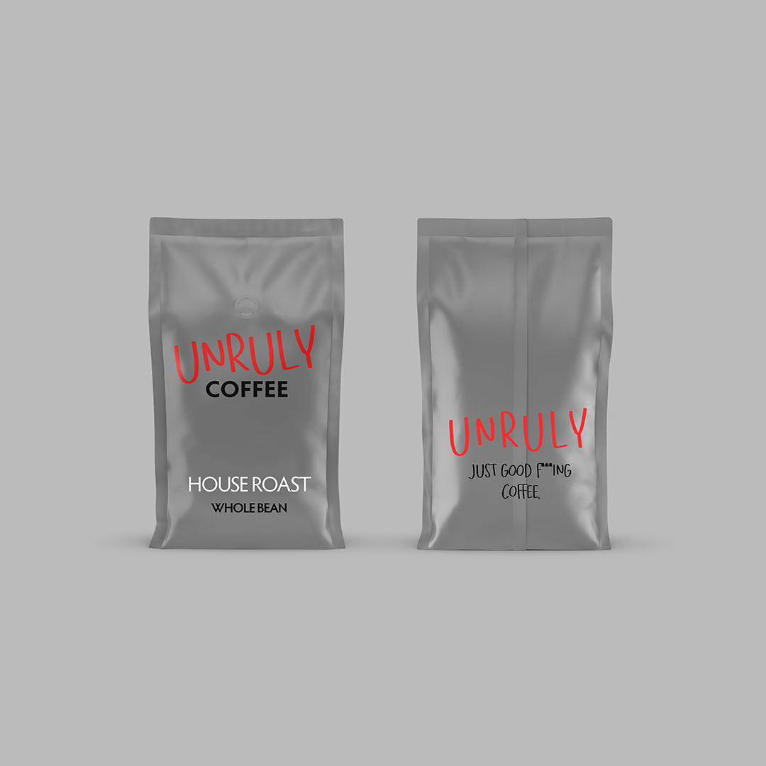 The logo is loud and simple — a handwritten “UNRULY” with attitude, anchored by a clean, secondary typeface for balance. Packaging followed suit: bold, stripped down, and built to stand out in a sea of beige craft coffee. Each roast (Dark, House, Espresso, Decaf) got its own minimal label, unified by tone and tension. Taglines like “Just Good F***ing Coffee” and “This Coffee Is Straight Up F***ing Delicious” said what the brand stood for — so we didn’t have to.
